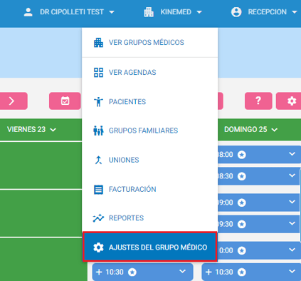 1. Desplegá las opciones del grupo médico y seleccioná “Ajustes del grupo médico”.