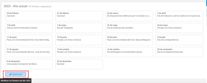 3. Desplazate hacia abajo hasta la sección “(Año actual) Feriados asignados” y hacé clic en “Modificar” para seleccionar o deseleccionar los feriados: