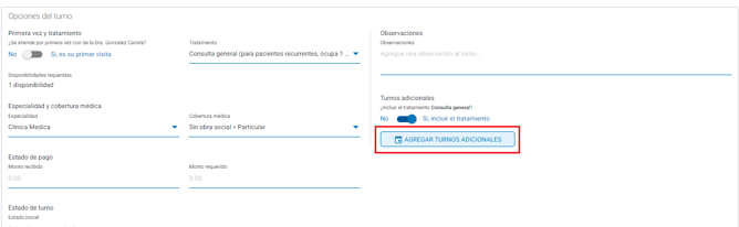 1. Desde la agenda, iniciá el proceso habitual para dar un turno. En la ventana del turno, hacé clic en “Agregar turnos adicionales”.