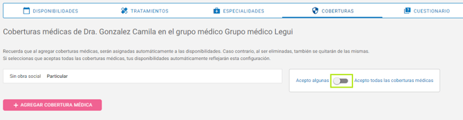 4. Hacé clic en el botón rosa “+ Agregar cobertura médica”. Escribí el nombre de la obra social y se desplegará la lista de planes disponibles