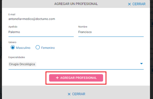 4. Se abrirá una ventana para completar los datos del profesional, una vez que lo hagas, hacé clic en “Agregar profesional” para confirmar.