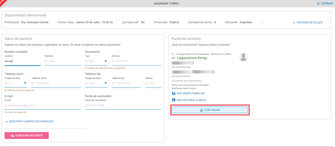 3. Para pacientes recurrentes, escribí alguno de sus datos en “Pacientes similares” y hacé clic en “Continuar”.