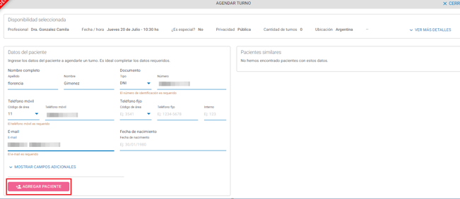 2. Se abrirá una ventana con la información de la disponibilidad y los campos del paciente. Completá los datos y hacé clic en “Agregar paciente”