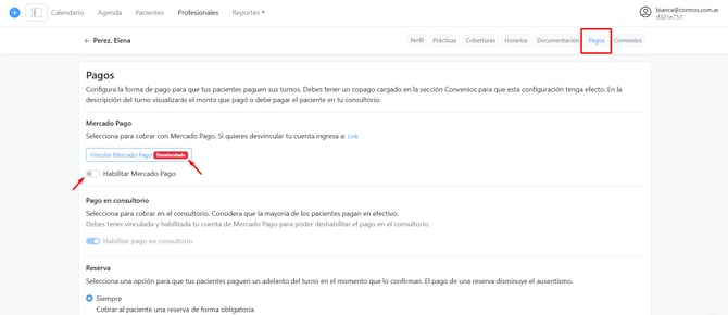 2. En caso de querer habilitar el pago en el consultorio, podrás hacerlo una vez que tu Mercado Pago esté correctamente vinculado