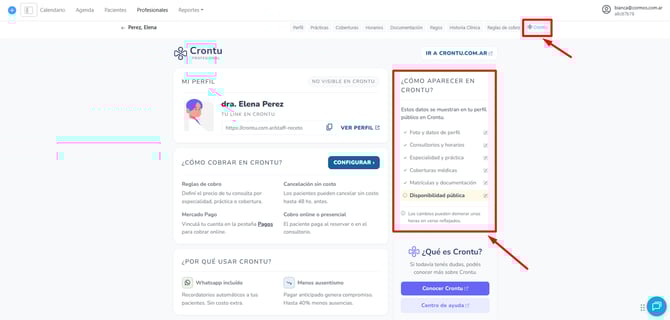 Dentro de tu perfil profesional, vas a encontrar una solapa llamada “Crontu”. Allí no solo vas a ver información sobre esta plataforma externa de turnos, sino también el estado de visibilidad de tu perfil y los requisitos necesarios para aparecer.
