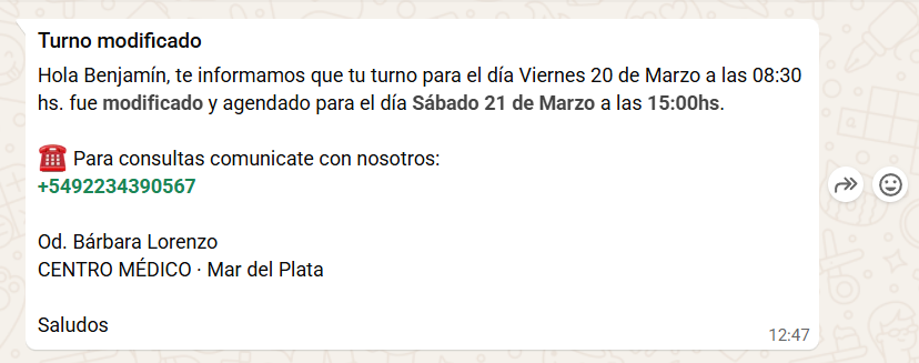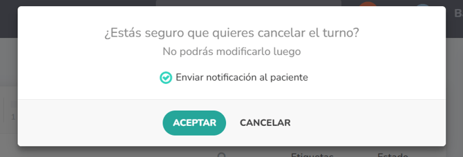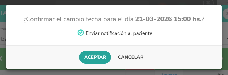 ⚠️ ¡ATENCIÓN! También se envían otros mensajes al paciente: cuando un turno se modifica o se cancela. Esos mensajes no son automáticos sino que dependen de la decisión del usuario. Por defecto siempre el check verde ✅ está activo pero lo pueden quitar. Aparecerá en una ventana de confirmación. Así...