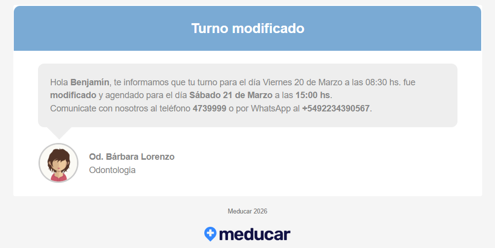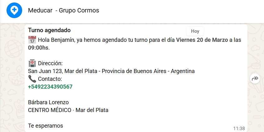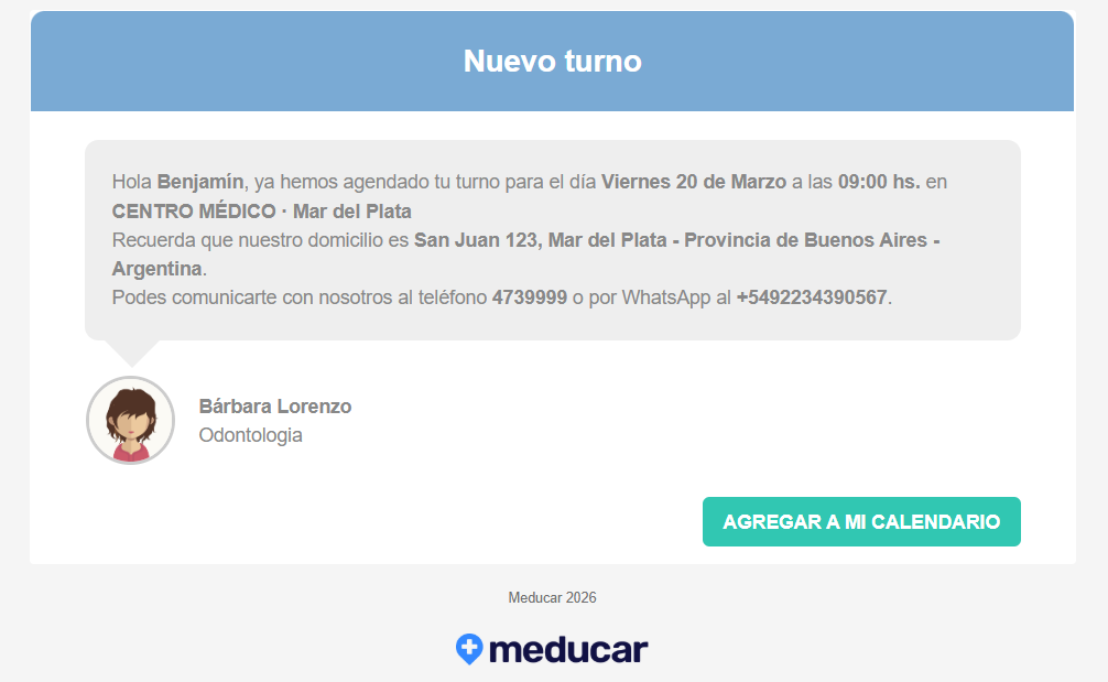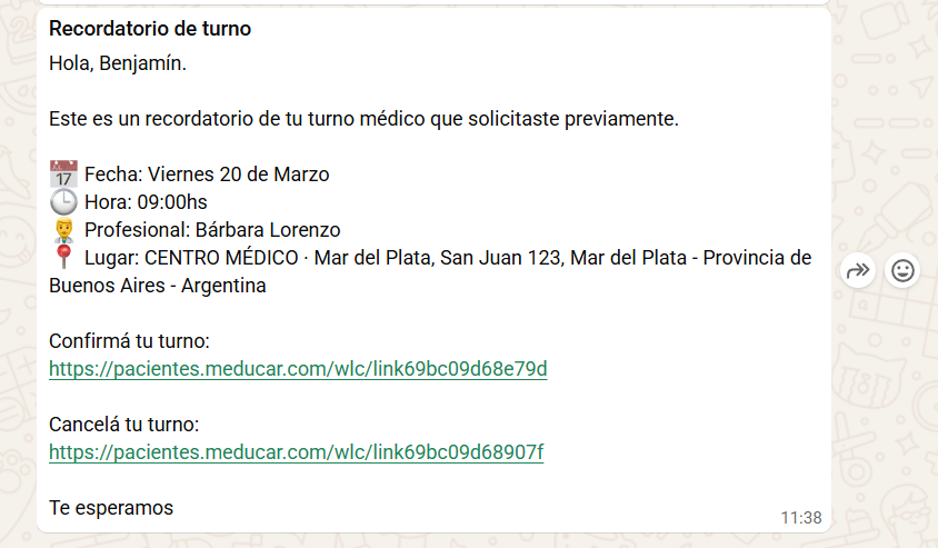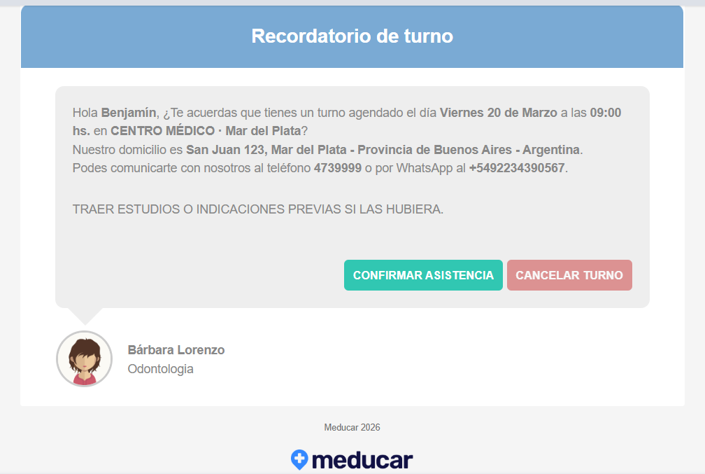 Por cada turno reservado Meducar envía dos mensajes: el primero es el de la reserva misma (que es inmediato) y el segundo corresponde al recordatorio de turno. Se pueden enviar por mail y/o whatsapp.