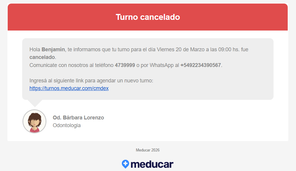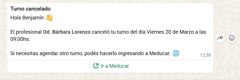 ✅ INCLUIR/NO INCLUIR la posibilidad de CANCELAR el turno. De esta manera aparecerá un link en el mensaje para que el paciente pueda utilizarlo;