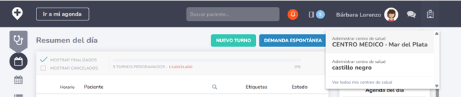 Al crear otro centro, podrán acceder a sus configuraciones desde ADMINISTRAR CENTRO DE SALUD. En ese menú desplegable, aparecerán todos los centros de salud que tengan creados.