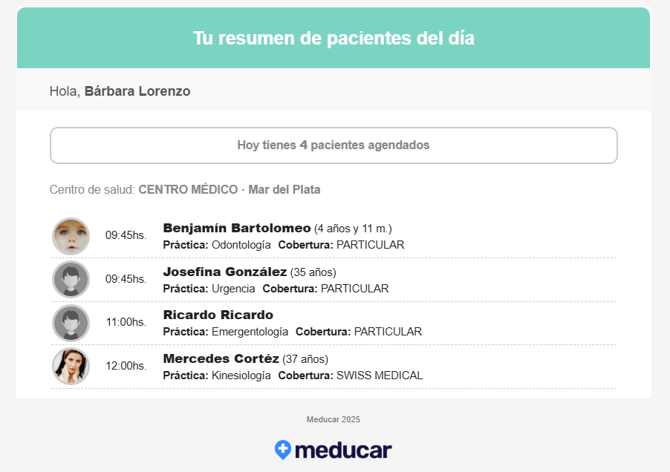Todos los profesionales recibirán automáticamente la agenda diaria de turnos, temprano por la mañana en su correo electrónico. A través de whatsapp, la pueden solicitar a demanda: la agenda del día y la del día siguiente.