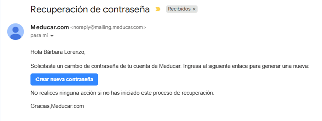 El correo que vas a recibir contiene un botón para CREAR NUEVA CONTRASEÑA....